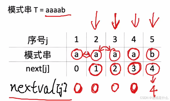 如图:当前 next[3] 指向的字符为1, j = 1时所指向的模式串为a;此时 a=a;所以 nextval[3] = nextval[next[1]] = 0.